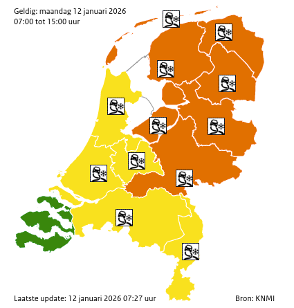 In Groningen, Drenthe, Flevoland en Overijssel kan het vanochtend ook plaatselijk licht ijzelen, maar is de kans hierop kleiner. Hiervoor is code geel van kracht.