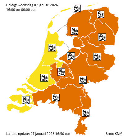 In het noordoosten is er vanochtend op uitgebreide schaal sprake van gladheid door ijzel. In de provincies Friesland, Groningen, Drenthe, Flevoland, Overijssel en Gelderland geldt hiervoor code oranje. Er is een grote kans op ongelukken door gladde bruggen, wegen, fietspaden en voetpaden. De gladheid is vaak moeilijk te zien, wat het voor weggebruikers verraderlijk maakt. Van het zuidwesten uit neemt de gladheid langzaam af. In de rest van het land, m.u.v. Zeeland, geldt nog code geel voor plaatselijke gladheid door sneeuw- of ijzelresten, vooral op binnenwegen. In de loop van de ochtend en middag zal de gladheid van het zuidwesten uit langzaam verdwijnen.